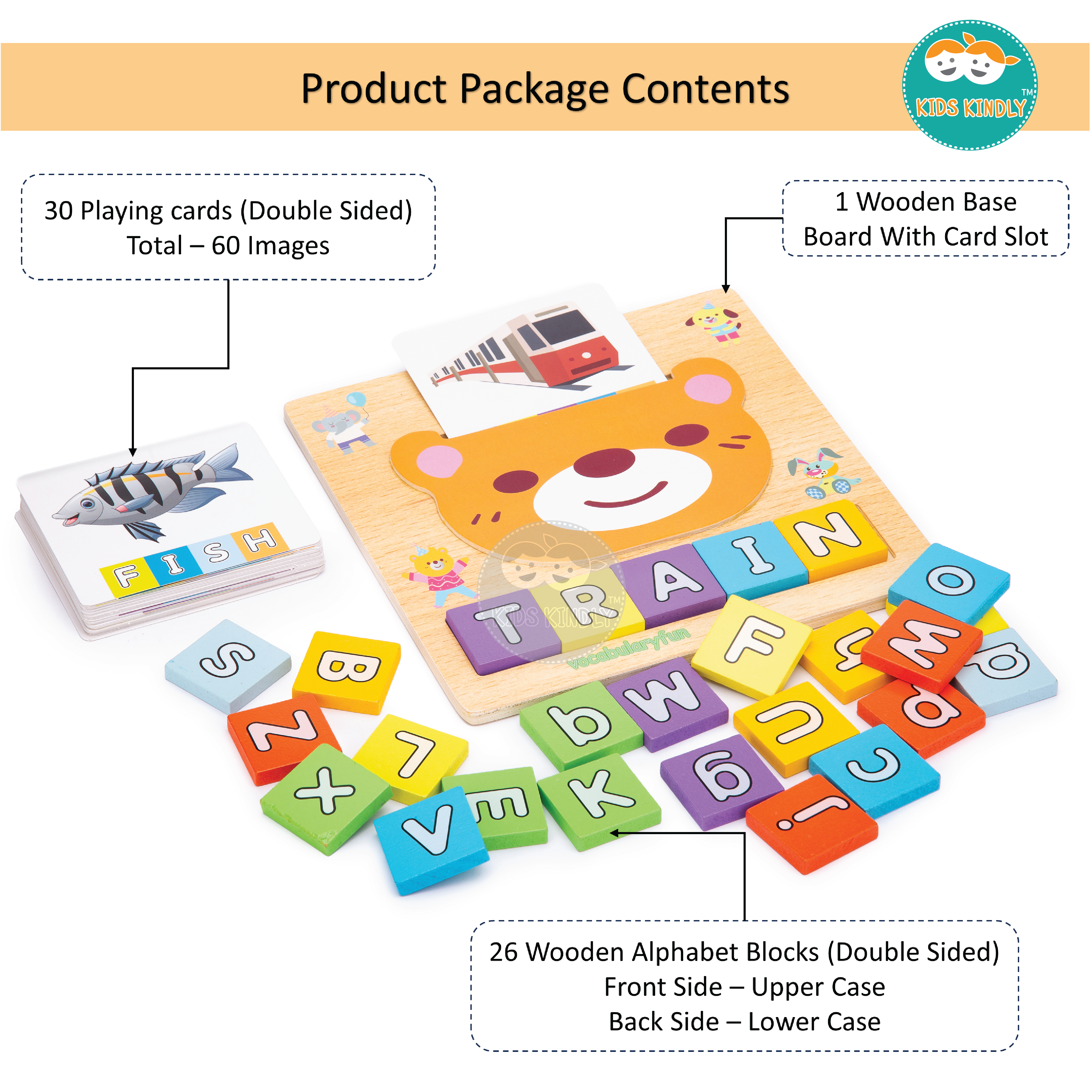 - How To Play: Simply Pick An Object Card And Fix It On The Wooden Holder Space. Observe The Word On The Spelling Card And Arrange The Alphabet Puzzle Pieces Accordingly. Start From Three-Letter Words And Increase The Complexity To Five-Letter Words.